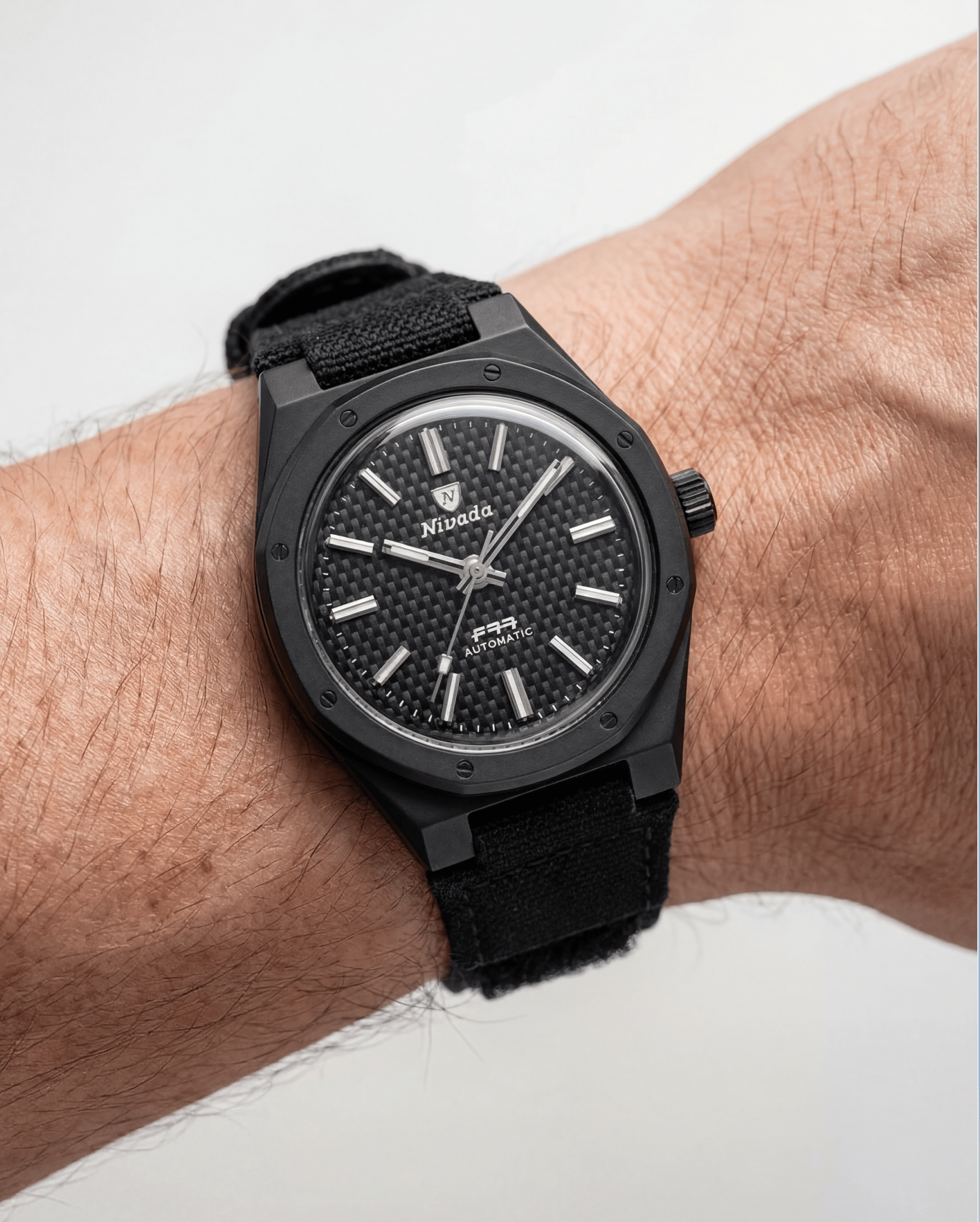 A rugged, lightweight canvas Velcro strap tailored to the MARK II F77 case geometry. It tapers from 22.7 mm to 16 mm and uses an IP black loop for a clean, stealthy finish. Strap lengths: 165 mm (long part) + 50 mm (short part).