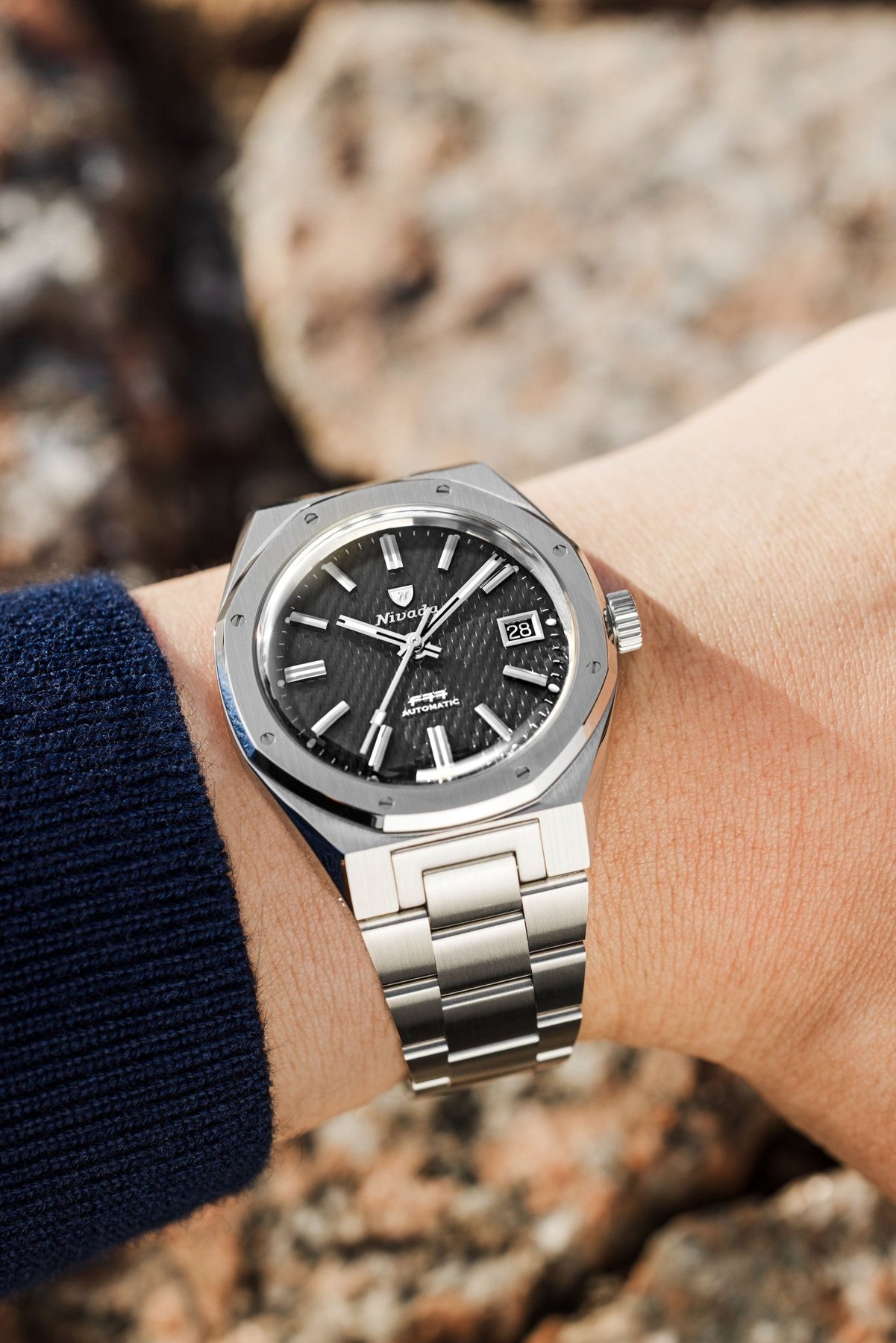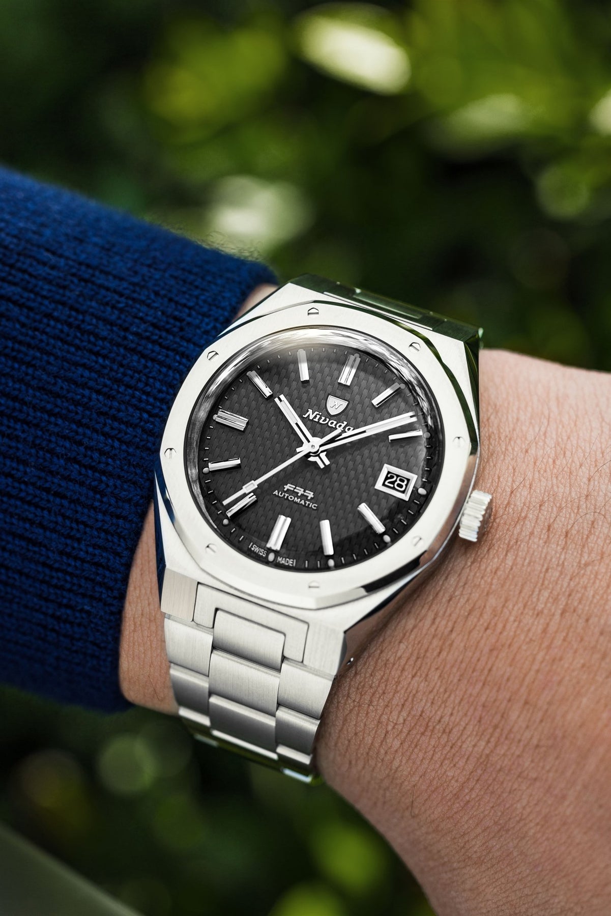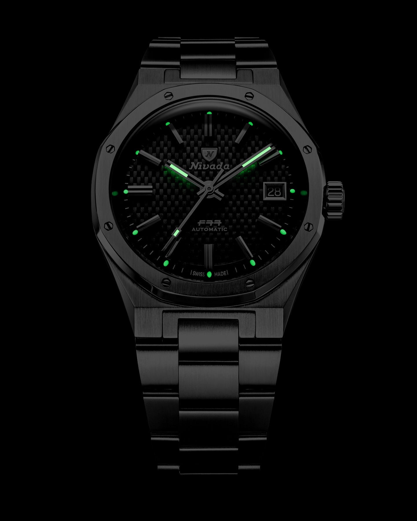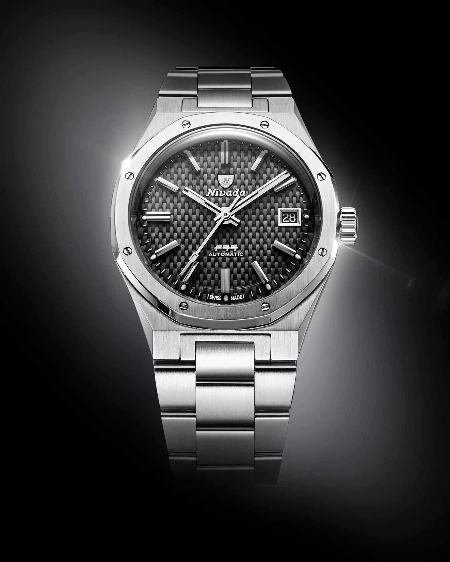 The F77 MKII Tressed Dial Black preserves the DNA of the original 1977 F77. Its embossed basket-weave dial creates depth and texture while maintaining perfect legibility. The interplay of light across the patterned surface enhances the applied indexes and faceted hands, reinforcing the architectural strength of the case. Housed in a 38mm stainless steel case with alternating brushed and polished finishes, the MKII refinement improves ergonomics while preserving the iconic octagonal bezel secured by eight visible screws. Inside, the Swiss automatic SOPROD P024 movement delivers precision and a 42-hour power reserve, with or without date display.