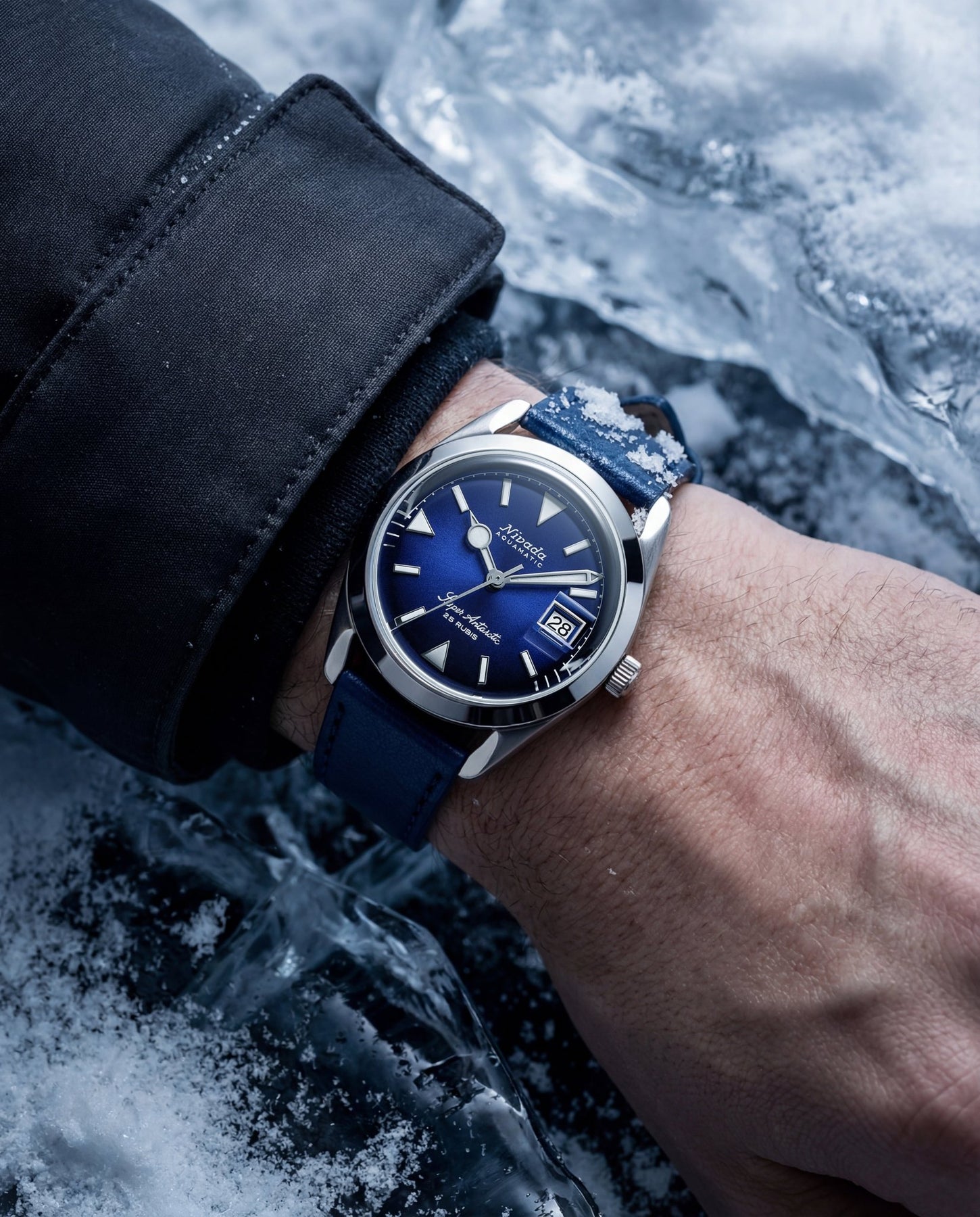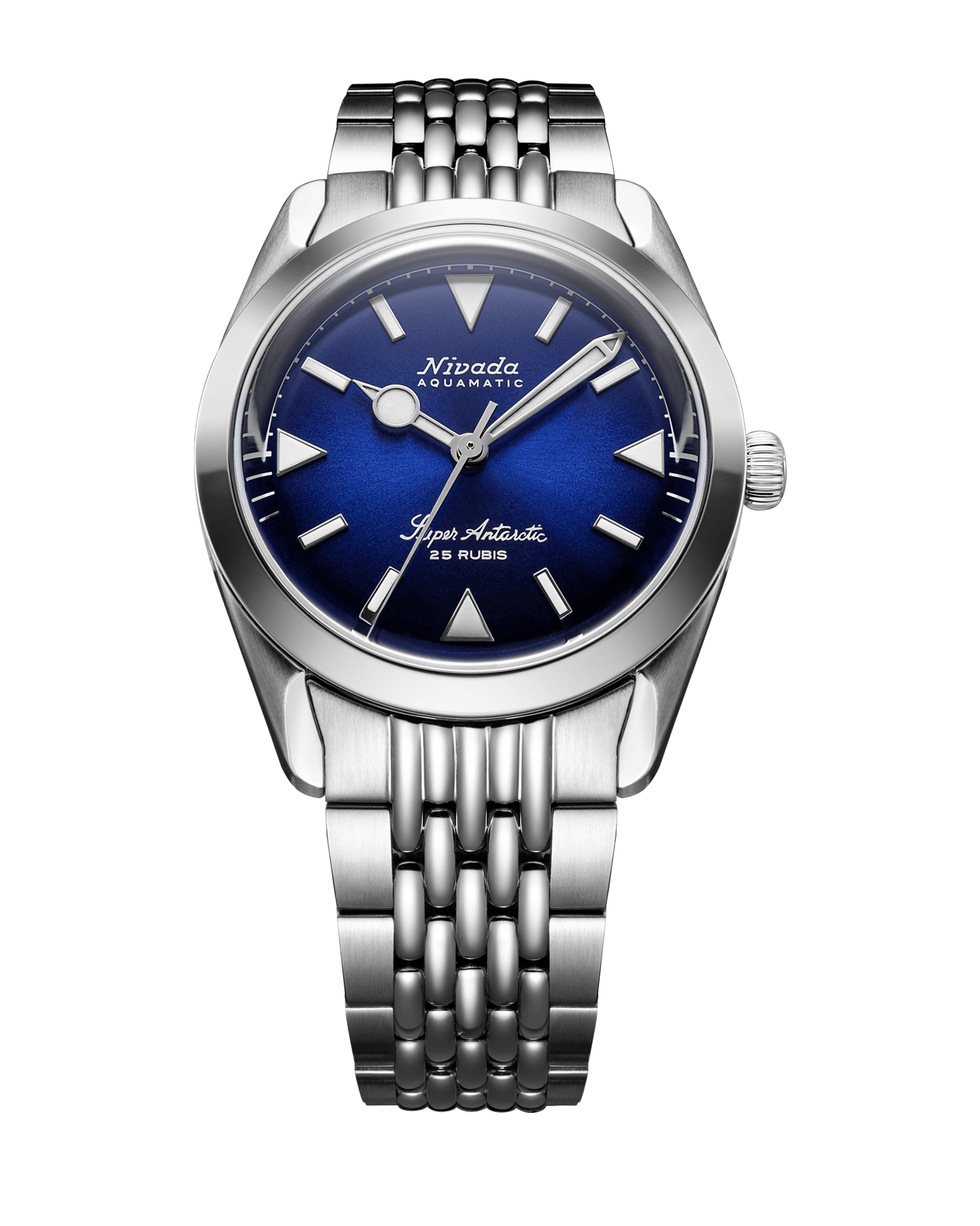 Super Antarctic Blue delivers the vintage-faithful proportions with modern upgrades: double-domed sapphire, Soprod P024 automatic, and a screw-down crown rated to 10 ATM / 100 m.